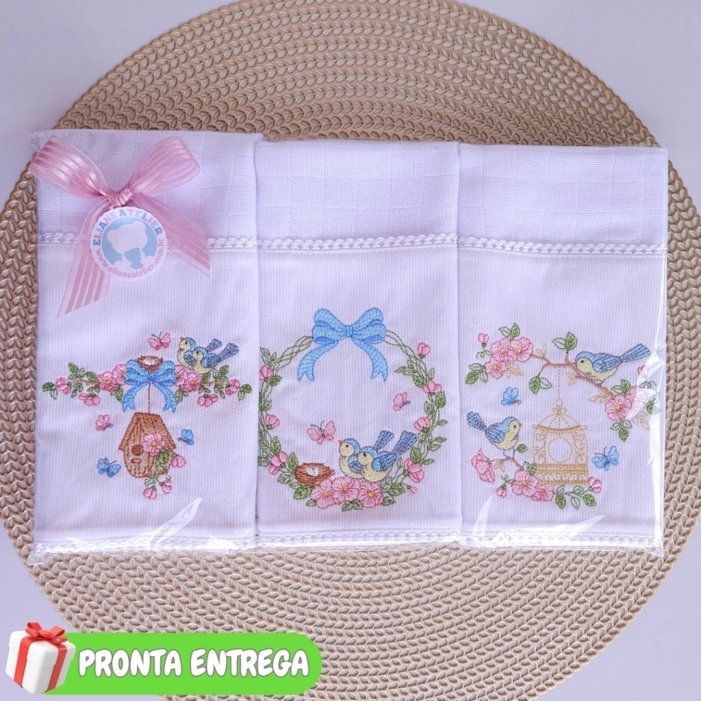 Kit Exclusivo: 3 Fraldas de Boca Bordadas – Pássaros & Flores