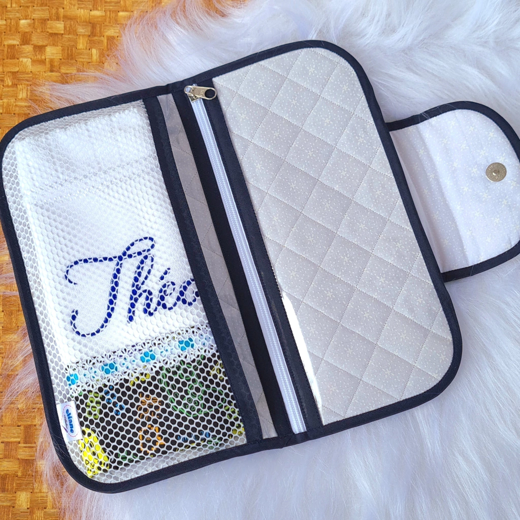 O estojo tem dois bolsos: um com zíper para guardar escova e pasta dental e um telado para guardar a toalhinha de forma que possa evaporar a umidade. O estojo é todo em material impermeável, facilitando a limpeza e a aba é personalizada com o nome escolhido.
